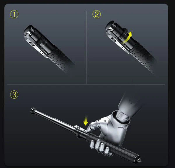 • Grip the Handle: Hold the handle of the Self Defense Tactical Rod and bend your arm back, ensuring a firm and secure grip.